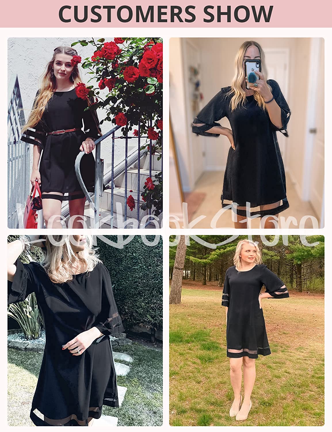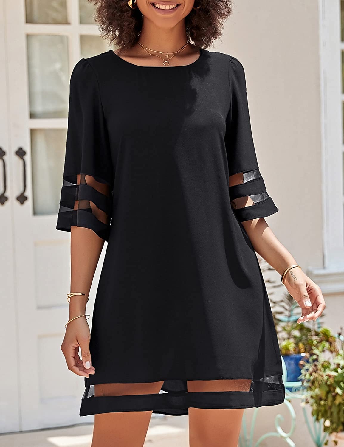 Women Casual Crewneck Mesh Panel 3/4 Bell Sleeve Loose Tunic Dress