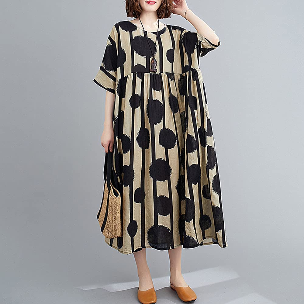 Women Cotton Linen Dress Casual Loose Bohemian Floral Maxi Dress with Pockets