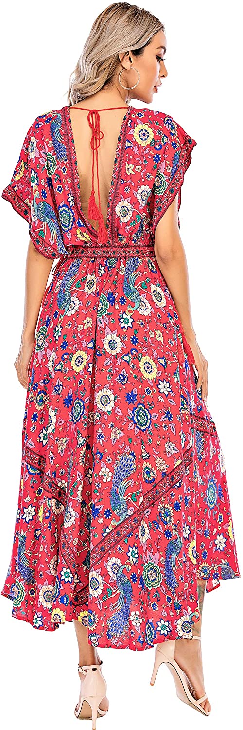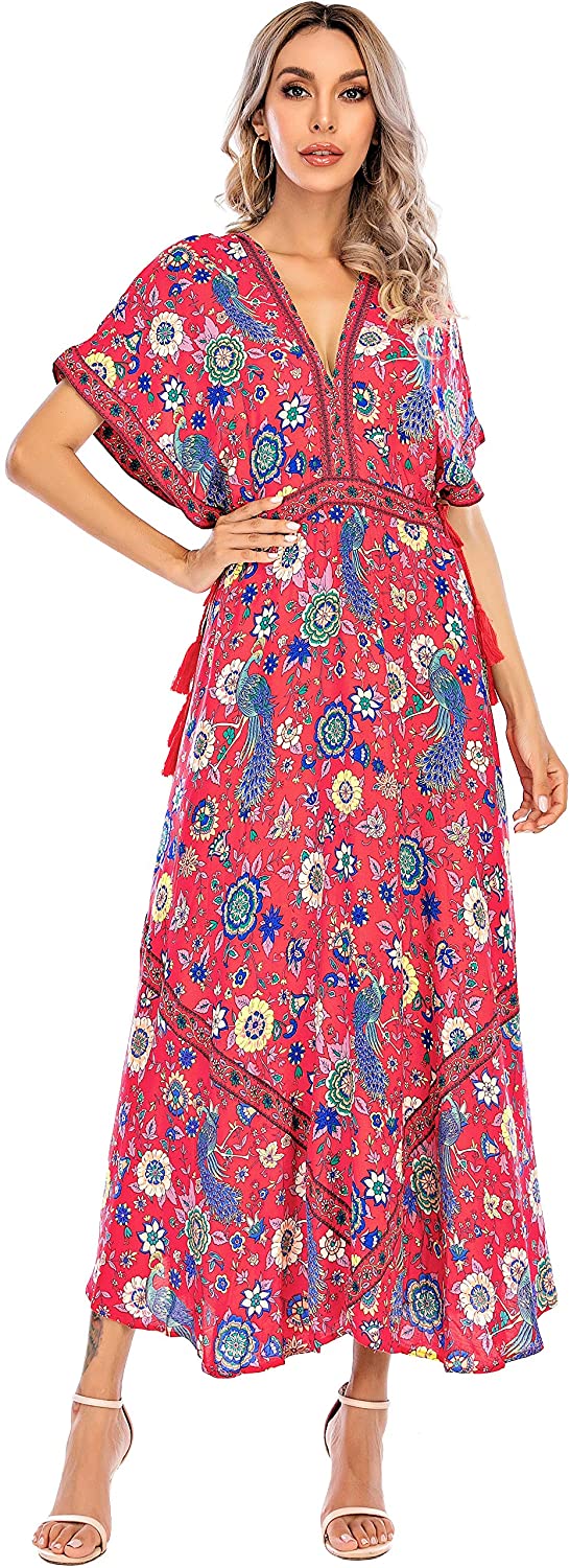 Women Summer Print Deep V Neck Cotton Beach Long Dresses