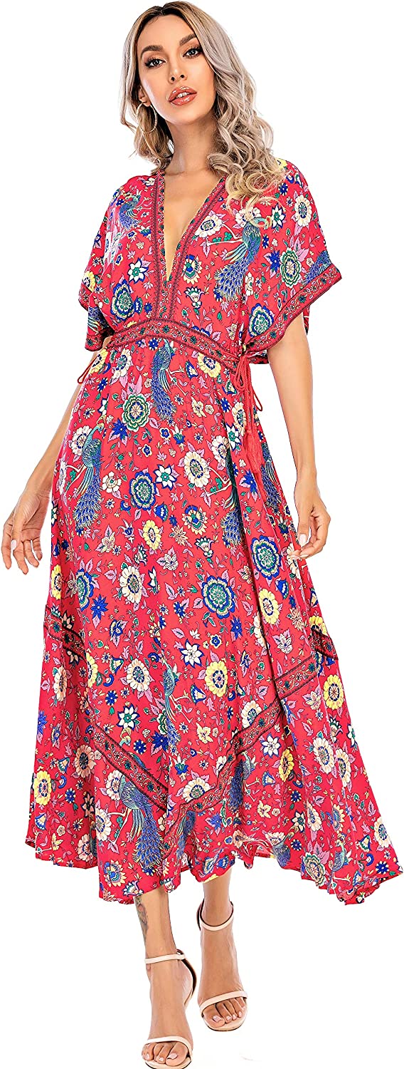 Women Summer Print Deep V Neck Cotton Beach Long Dresses