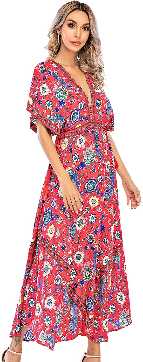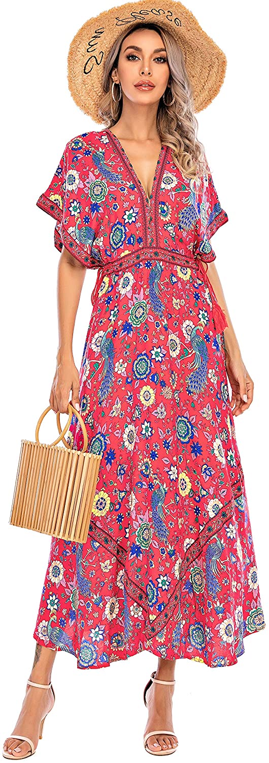 Women Summer Print Deep V Neck Cotton Beach Long Dresses