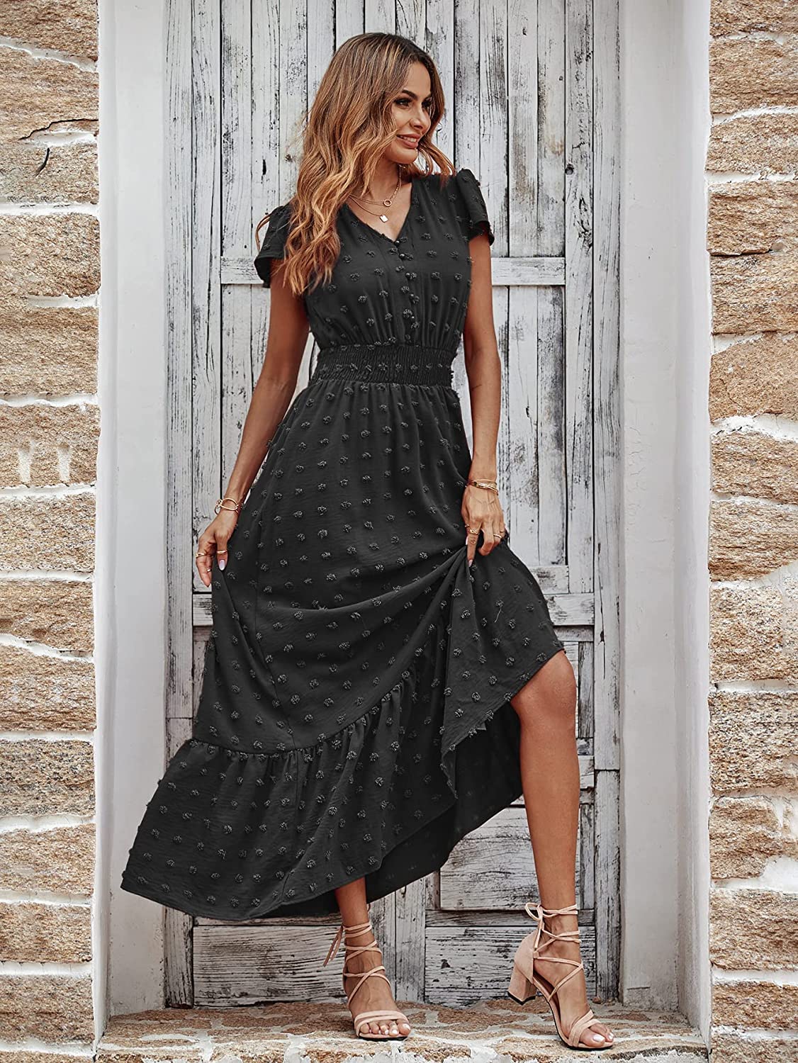 Women's Boho Dress Short Sleeve V Neck Swiss Dot Ruffle Tiered Maxi Dress Smocked Cocktail Dress