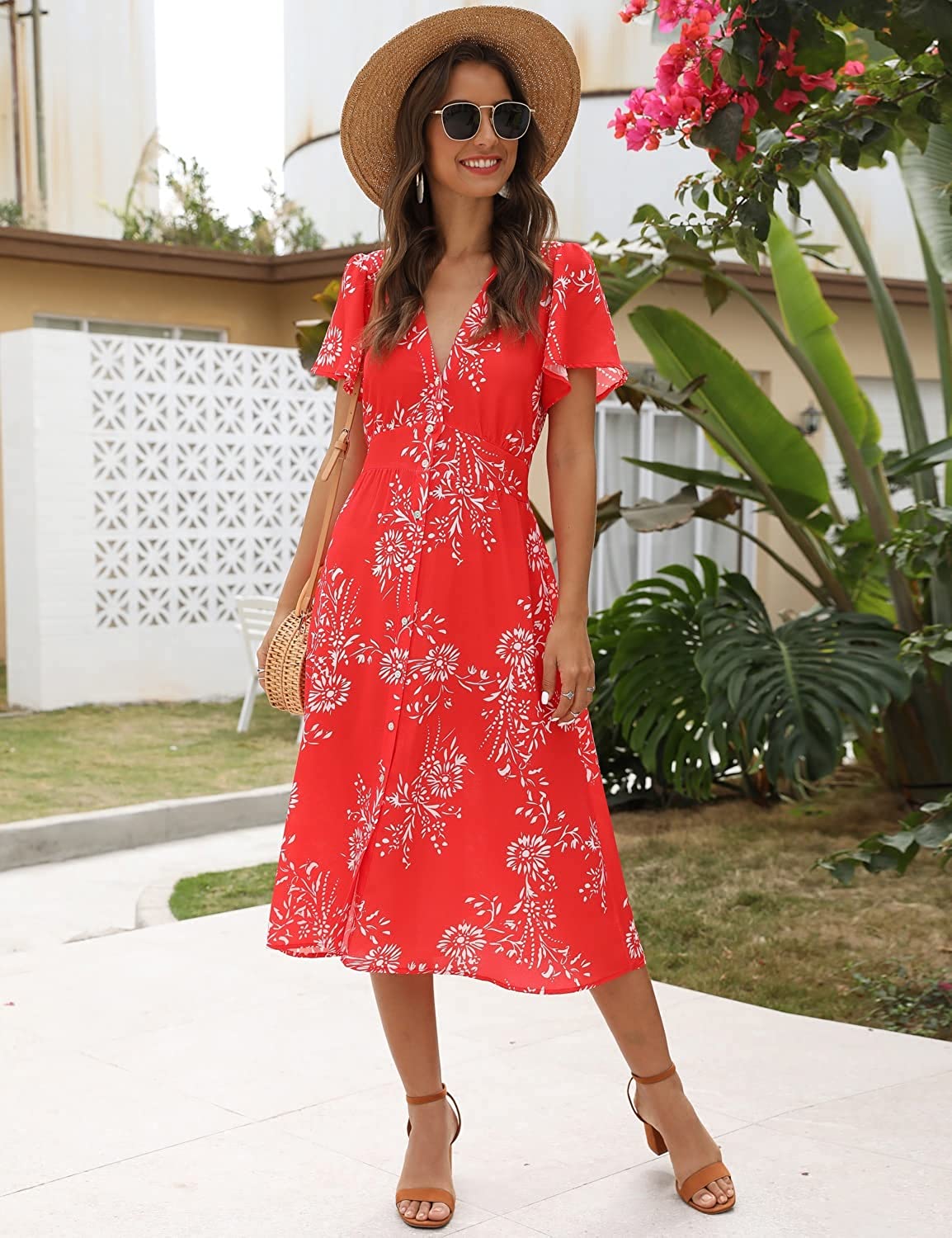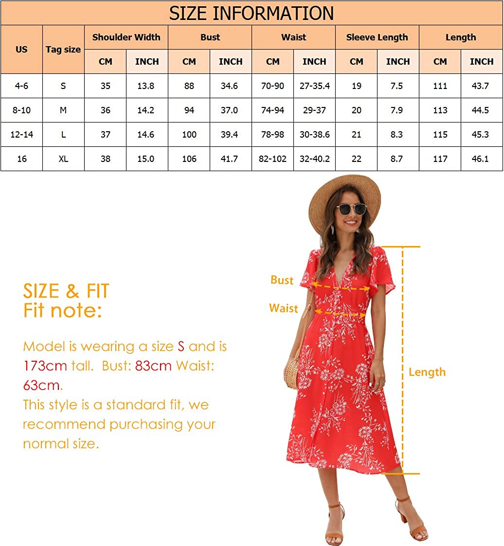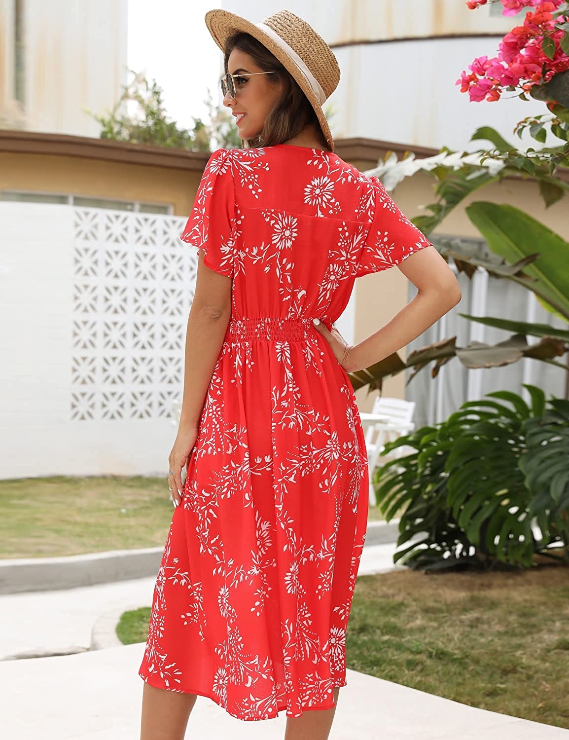 Women's Floral Button Up Split Dress Deep V Short Bell Sleeve Casual Midi Dress with Pockets