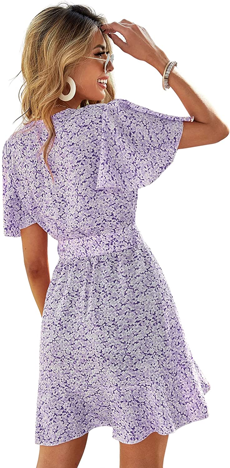 Women's Floral Tie Front Ruffle Mini Dress V Neck Short Sleeve A Line Flare Dresses