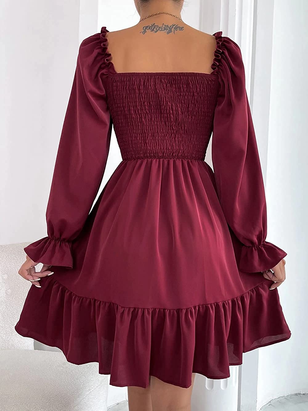 Womens Midi Dresses Solid Long Sleeve Dress Casual Square Neck High Waist A Line Ruffle Mini Short Dresses for Women
