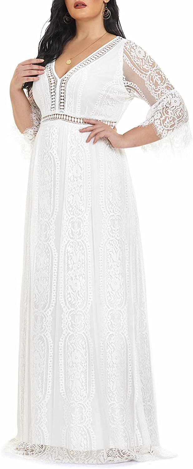Women's Plus Size Boho Maxi Floral Lace Bohemian Wedding Dress V Neck Flowy Long Party Dresses