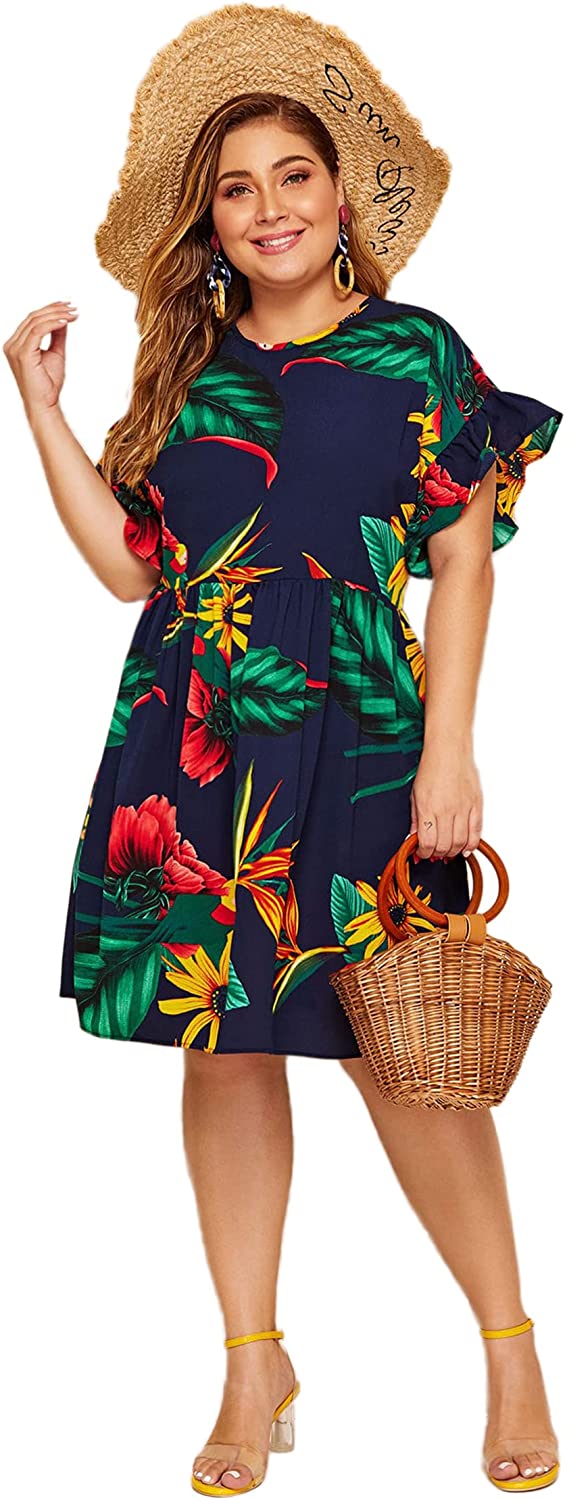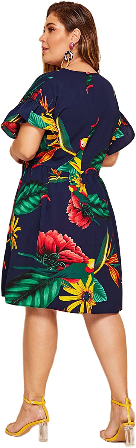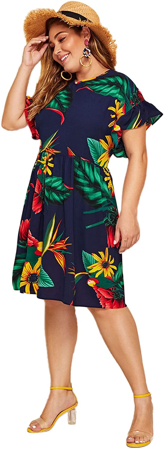 Women's Plus Size Tropical Leaf Print Ruffle Sleeve Pleated Short Dress