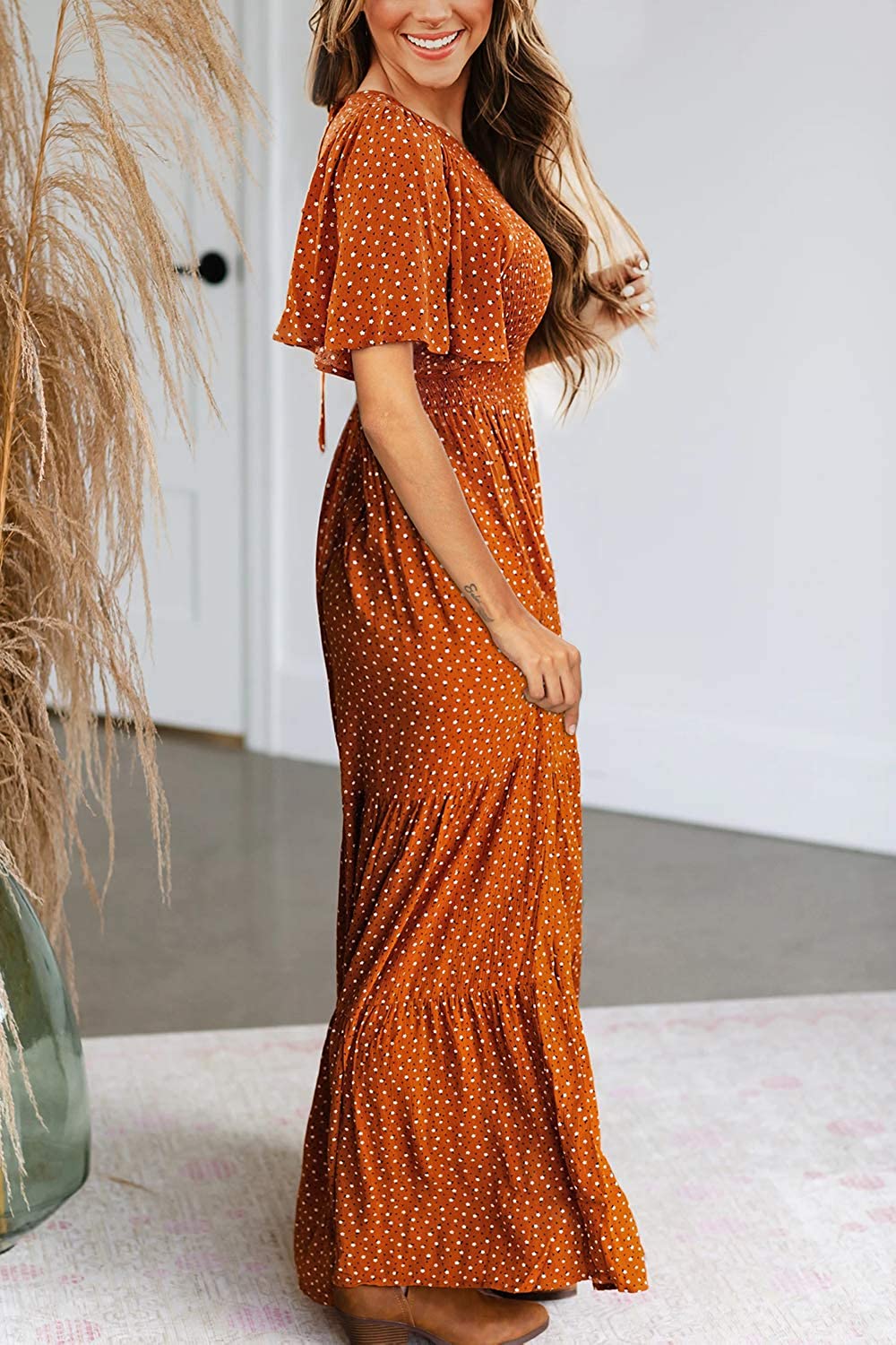 Women's Round Neck Short Flutter Sleeve Smocked Ruffle Floral Maxi Dress
