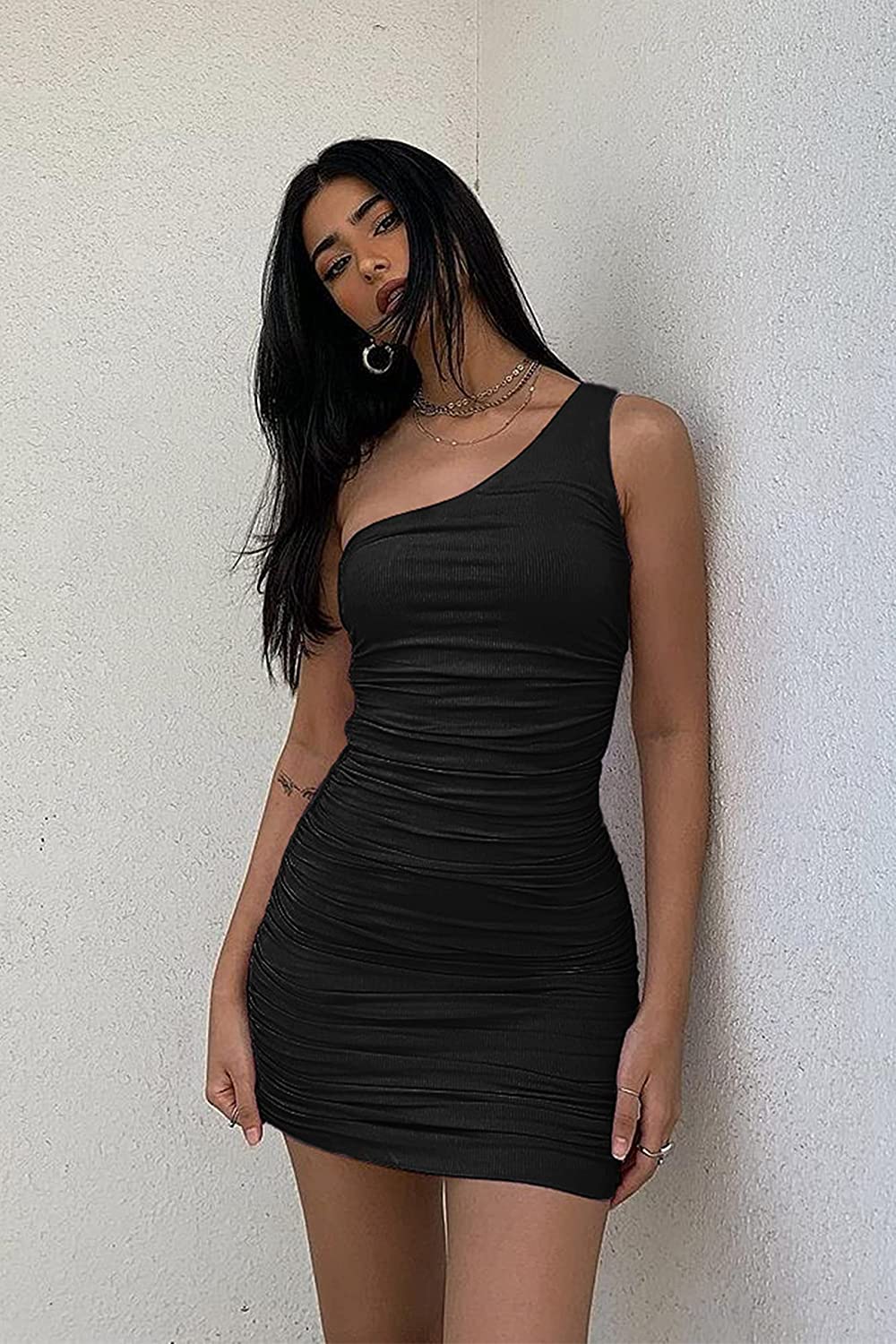 Women's Ruched Mini Dress Sexy One Shoulder Sleeveless Party Cocktail Bodycon Short Dresses