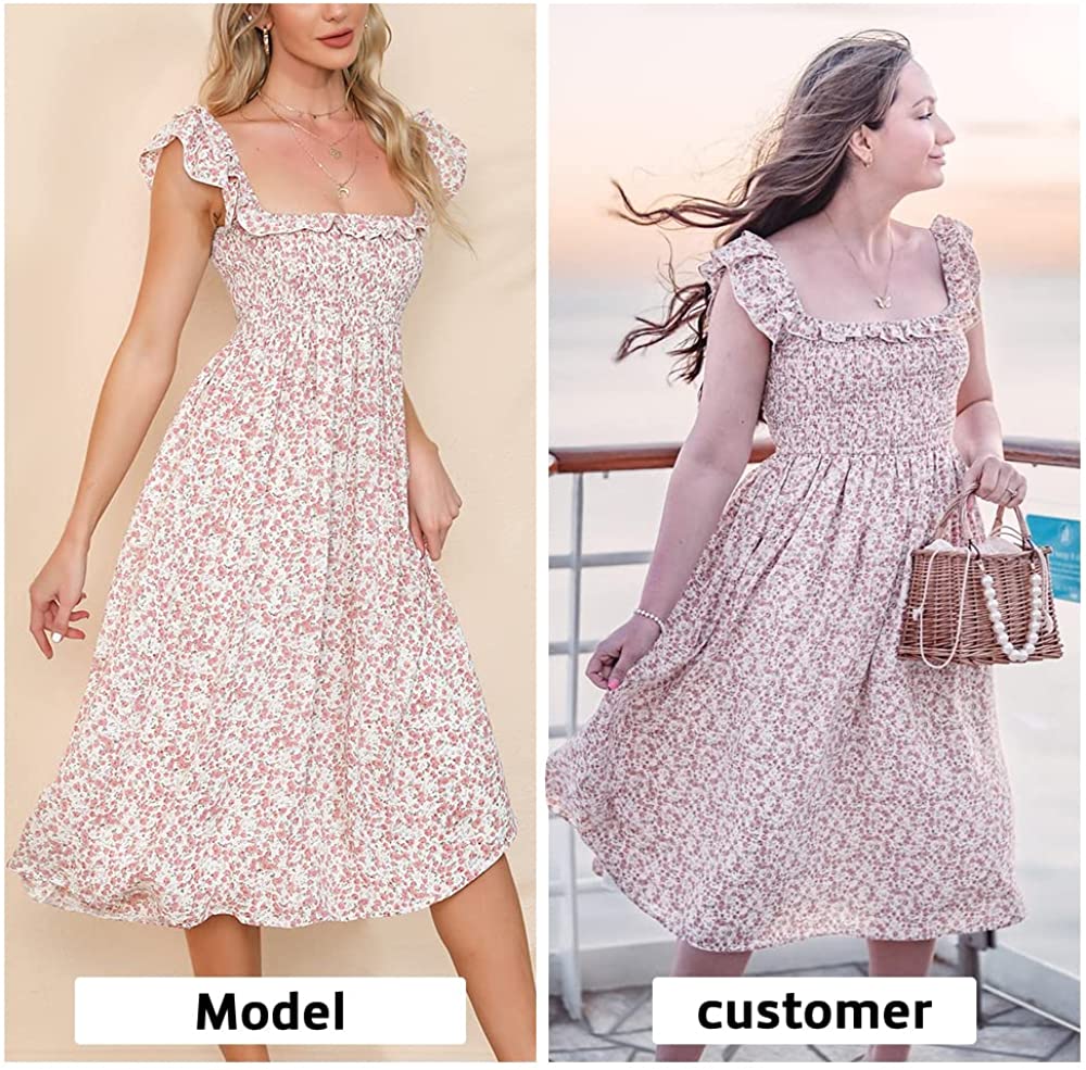 Women's Sleeveless Dress Square Neck Floral Print High Waist A-line Ruffle Smocked Backless Midi Dress