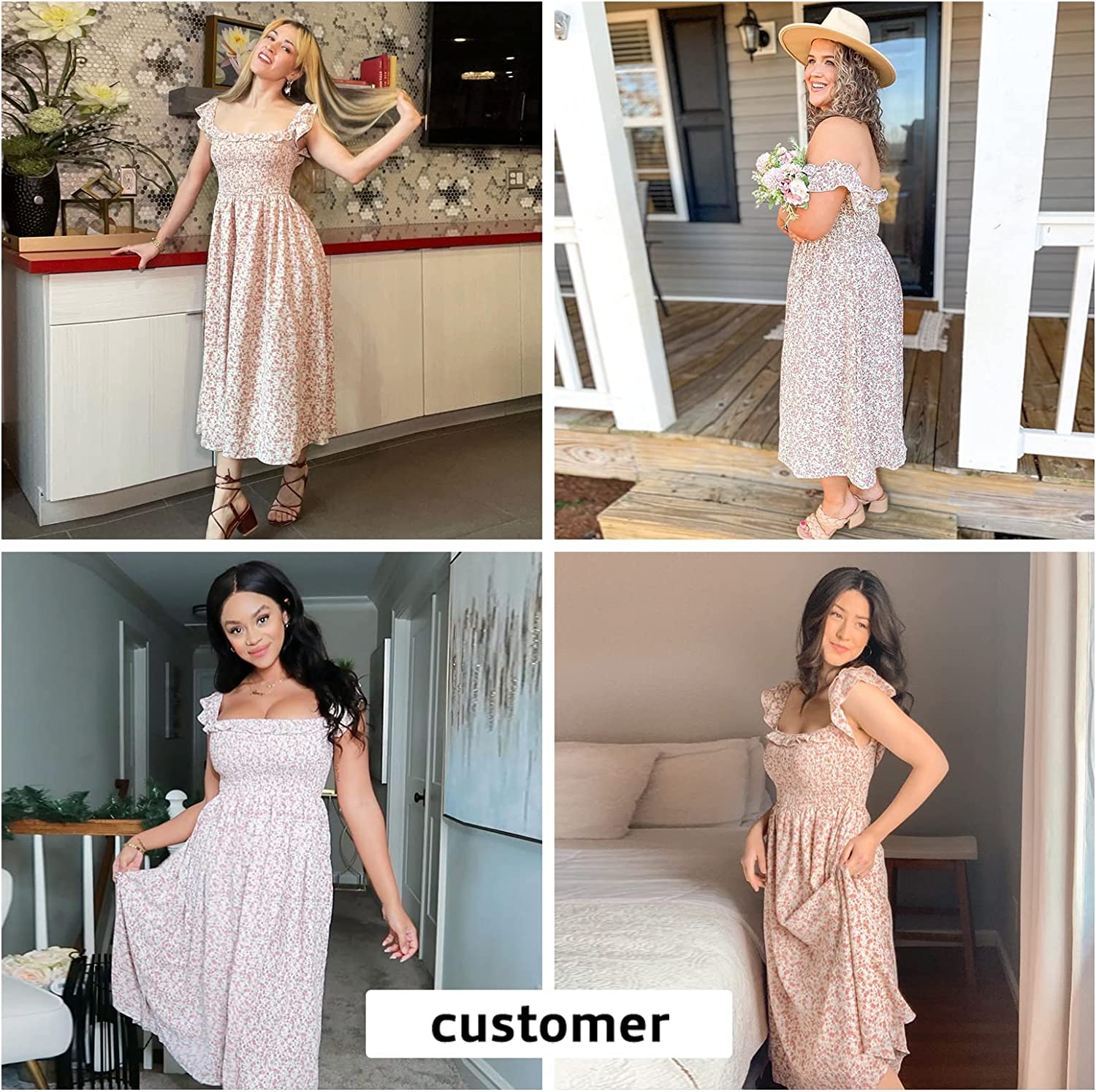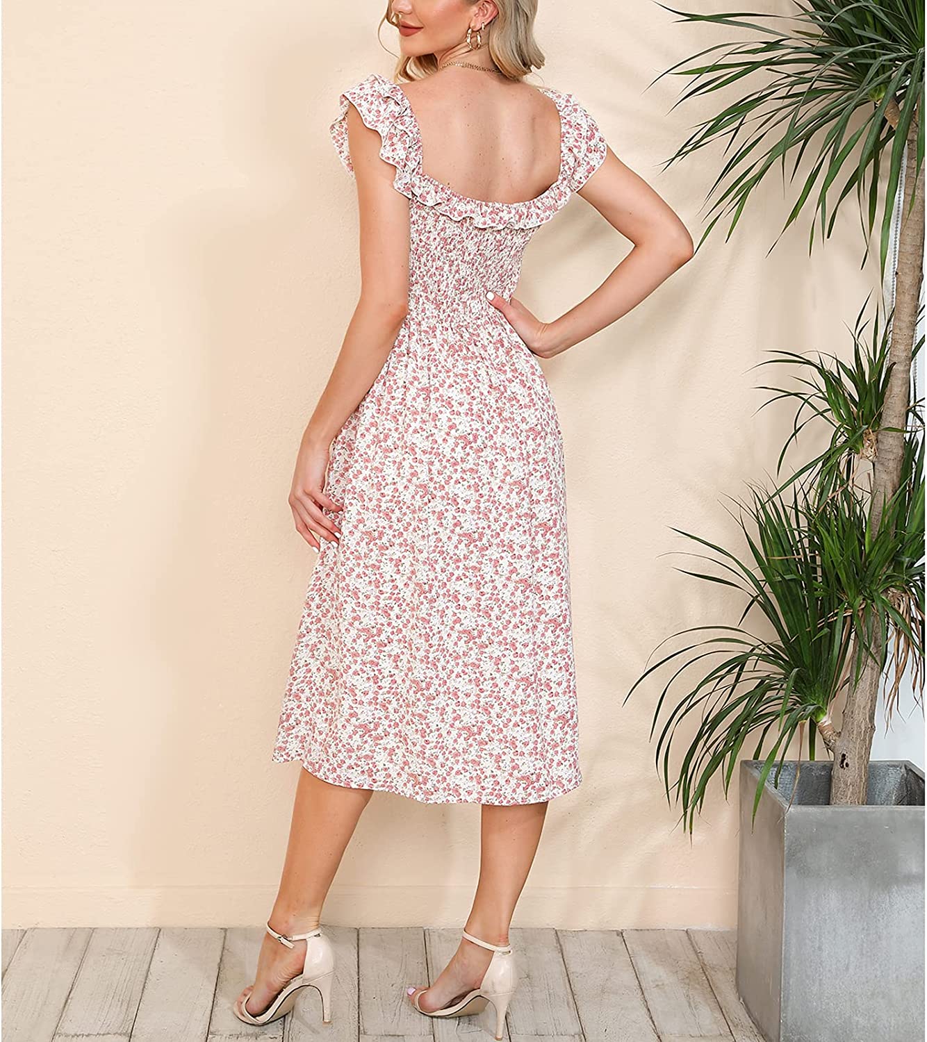 Women's Sleeveless Dress Square Neck Floral Print High Waist A-line Ruffle Smocked Backless Midi Dress