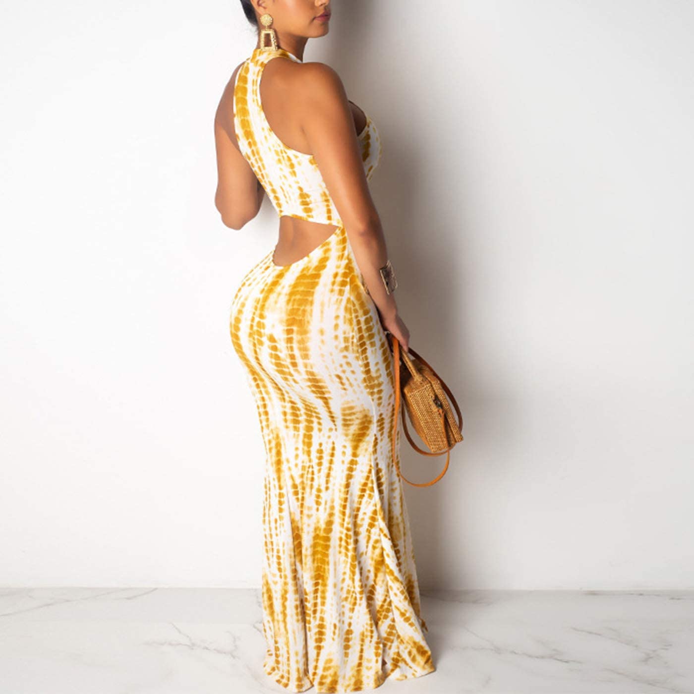 Women's Sleeveless Halter Neck Hollow Out Vintage Floral Print Party Beach Evening Long Maxi Dress