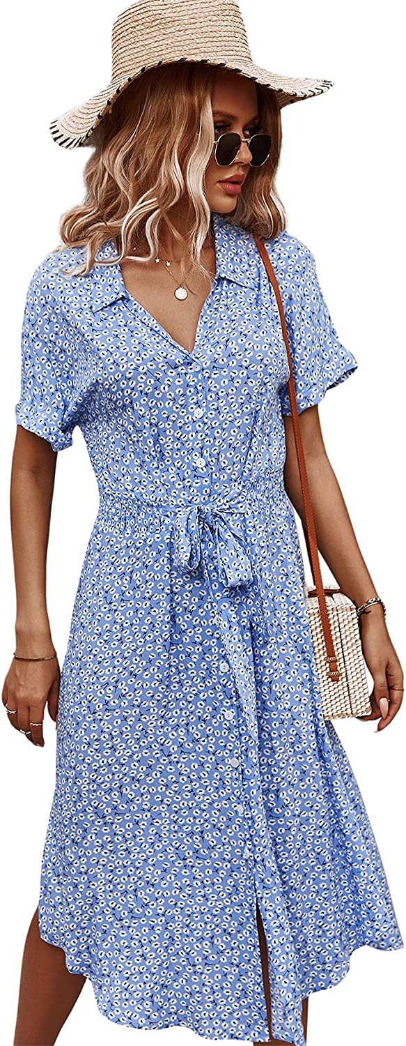 Womens Summer Dress Casual Ditsy Floral Tie Front Button Up Boho Midi Tshirt Dresses