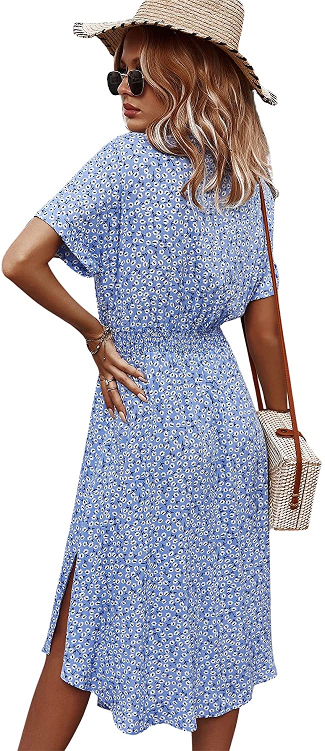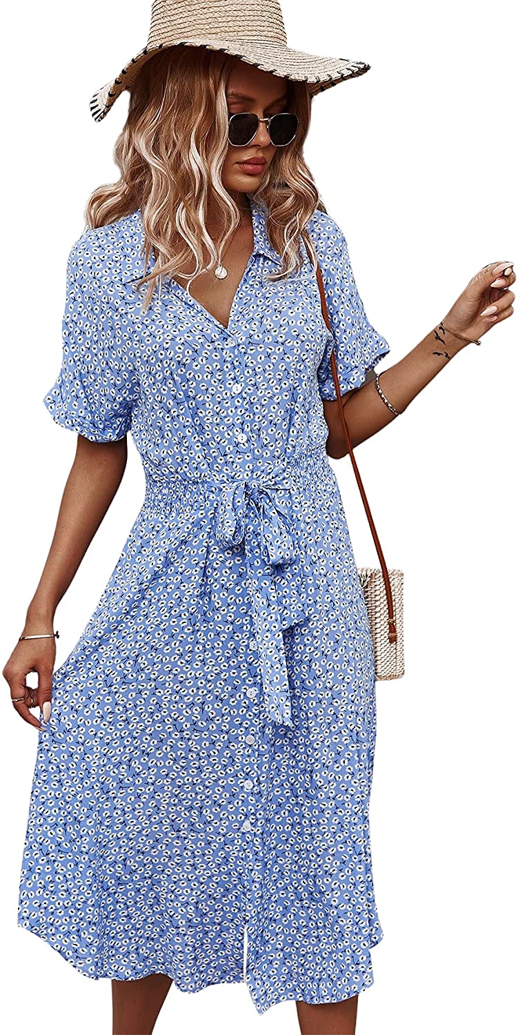 Womens Summer Dress Casual Ditsy Floral Tie Front Button Up Boho Midi Tshirt Dresses