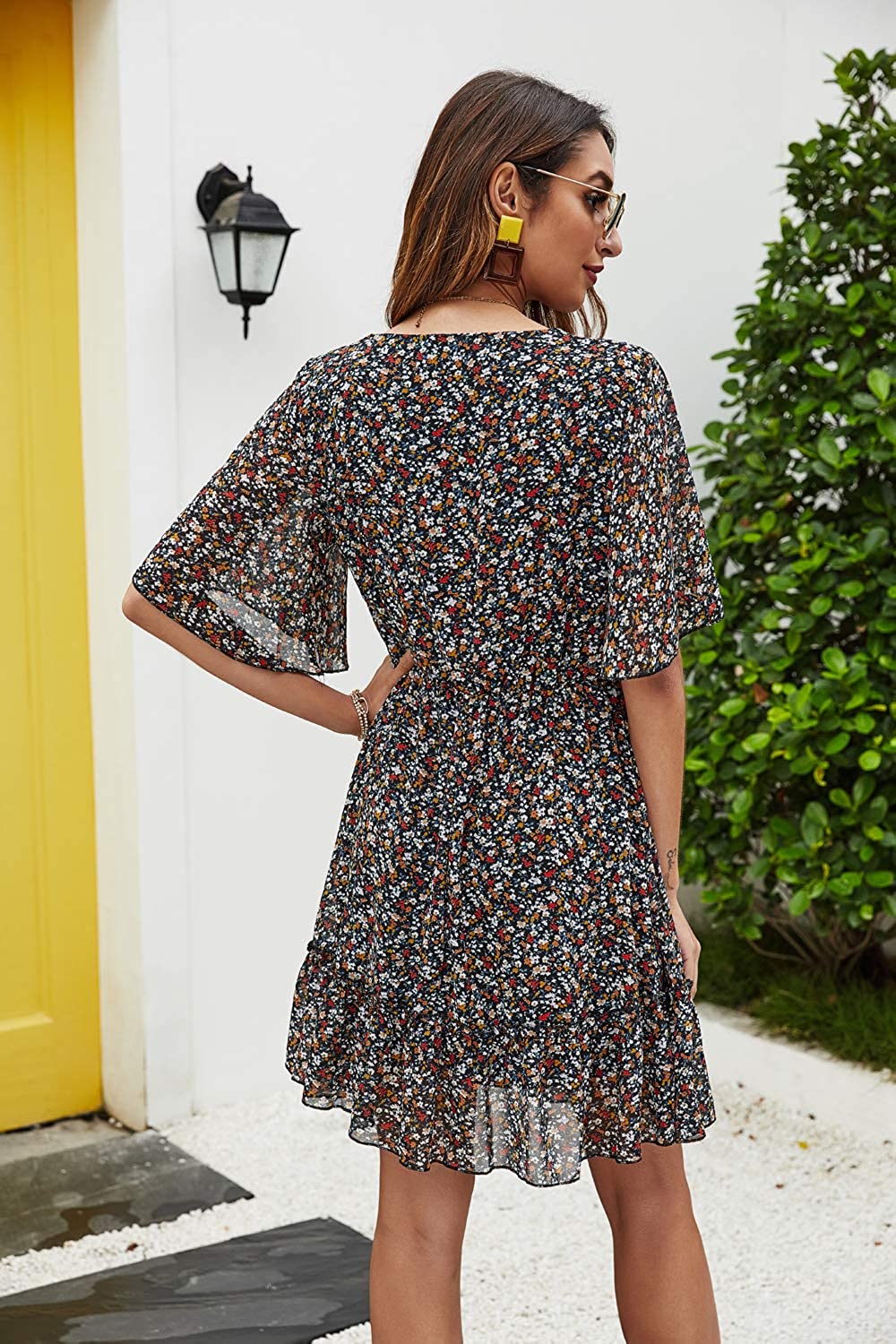 Women's Summer Floral Print V Neck Casual Mini Boho Ruffle Swing Dress MY068