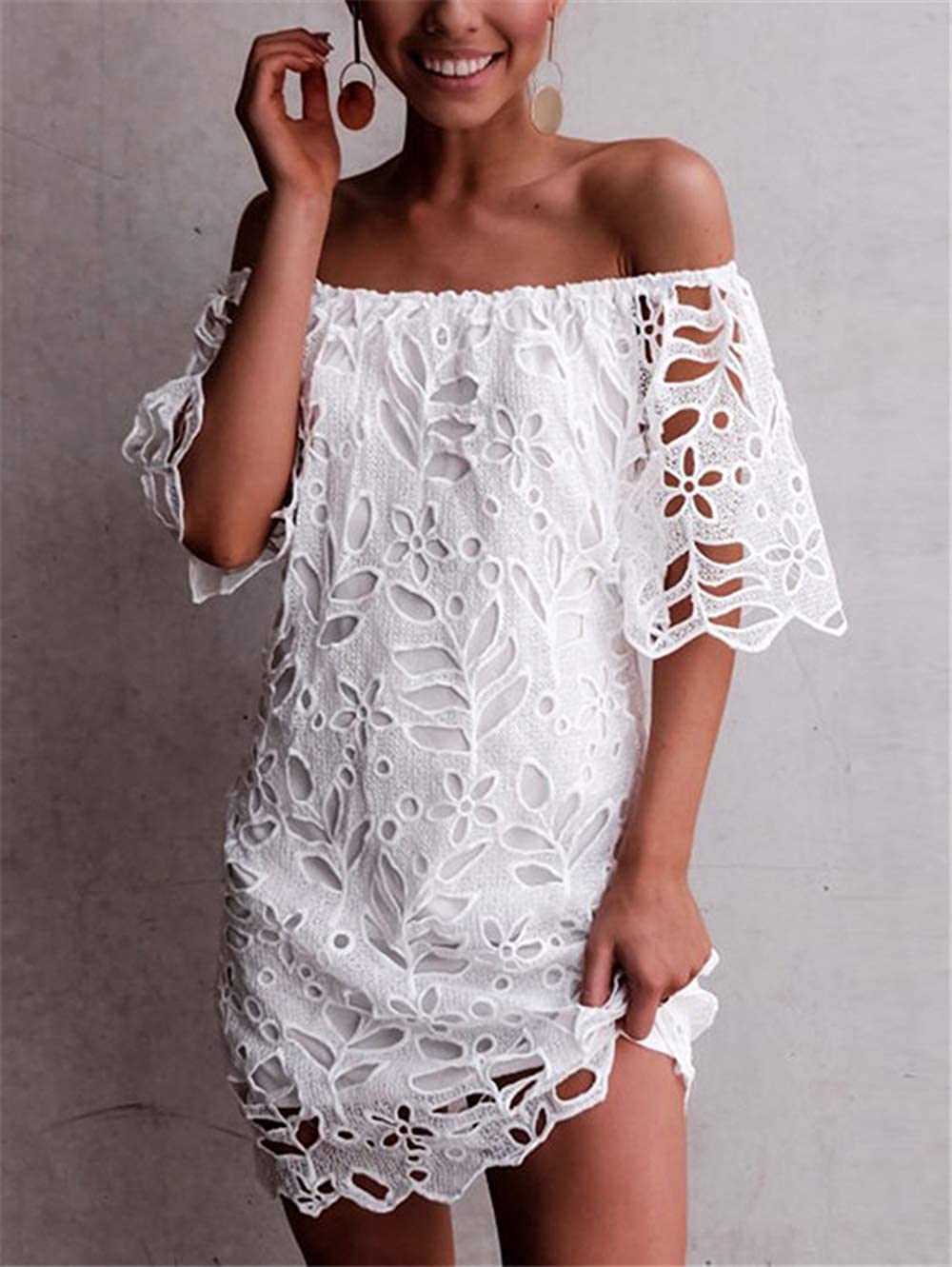 Women's Summer Off Shoulder Vintage Floral Lace Flare Short Sleeve Loose Elegant Mini Dress
