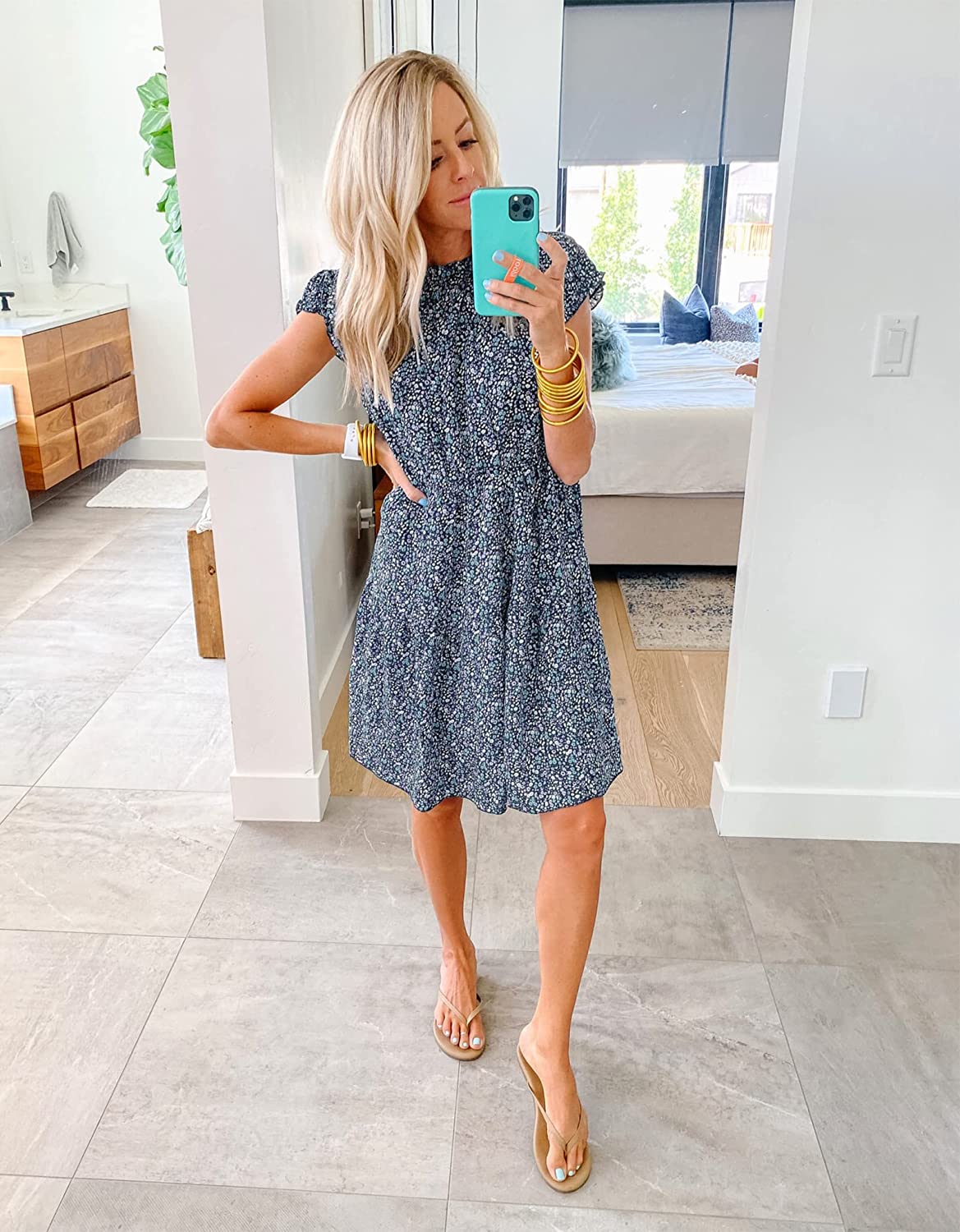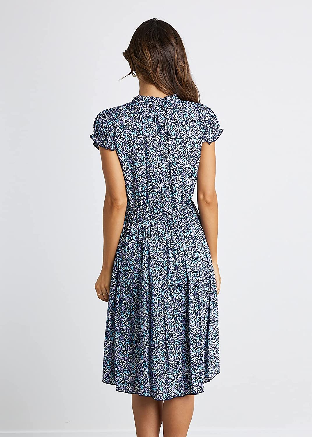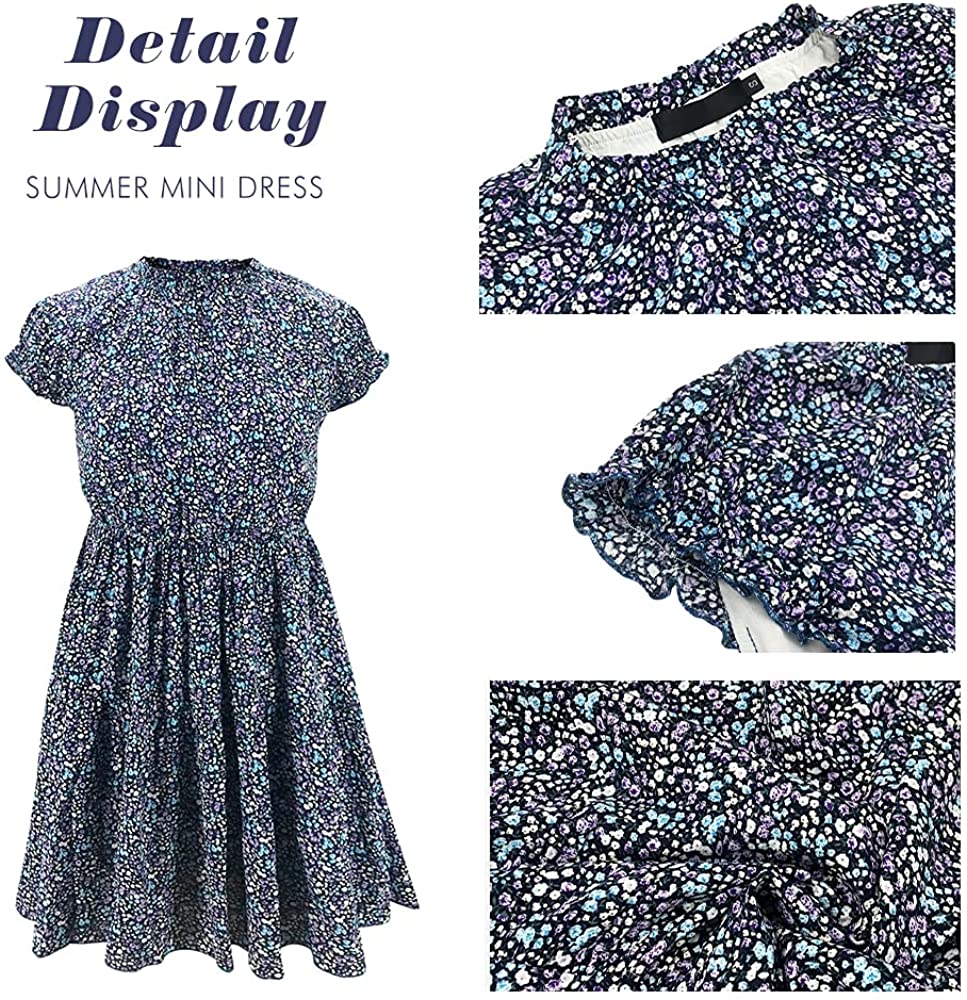 Women’s Summer Sleeveless Ruffle Sleeve Crew Neck Floral Print Mini Dress Casual Loose Flowy Plaid Pleated Dress