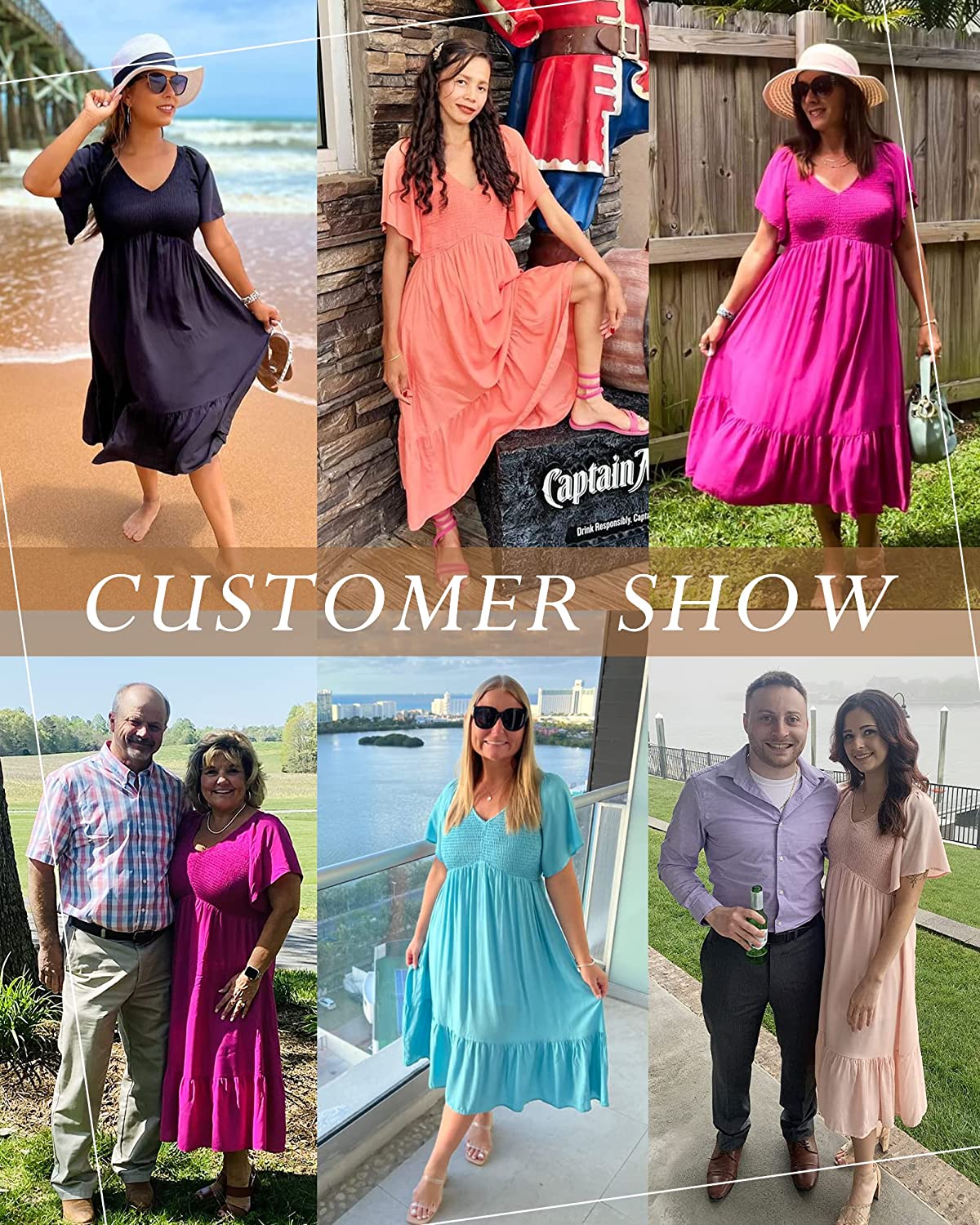 Women's Summer Tiered Dress Smocked Flutter Short Sleeve V Neck Midi Dresses
