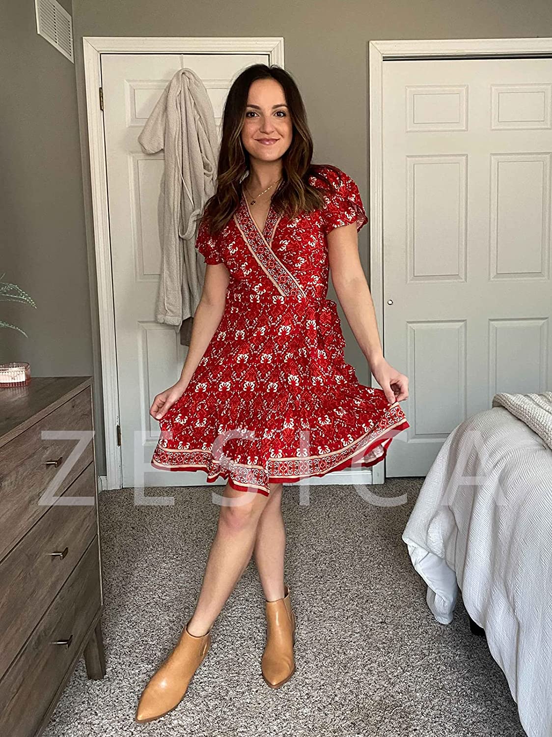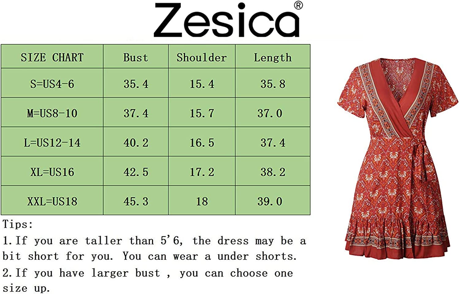 Women’s Summer Wrap V Neck Bohemian Floral Print Ruffle Swing A Line Beach Mini Dress