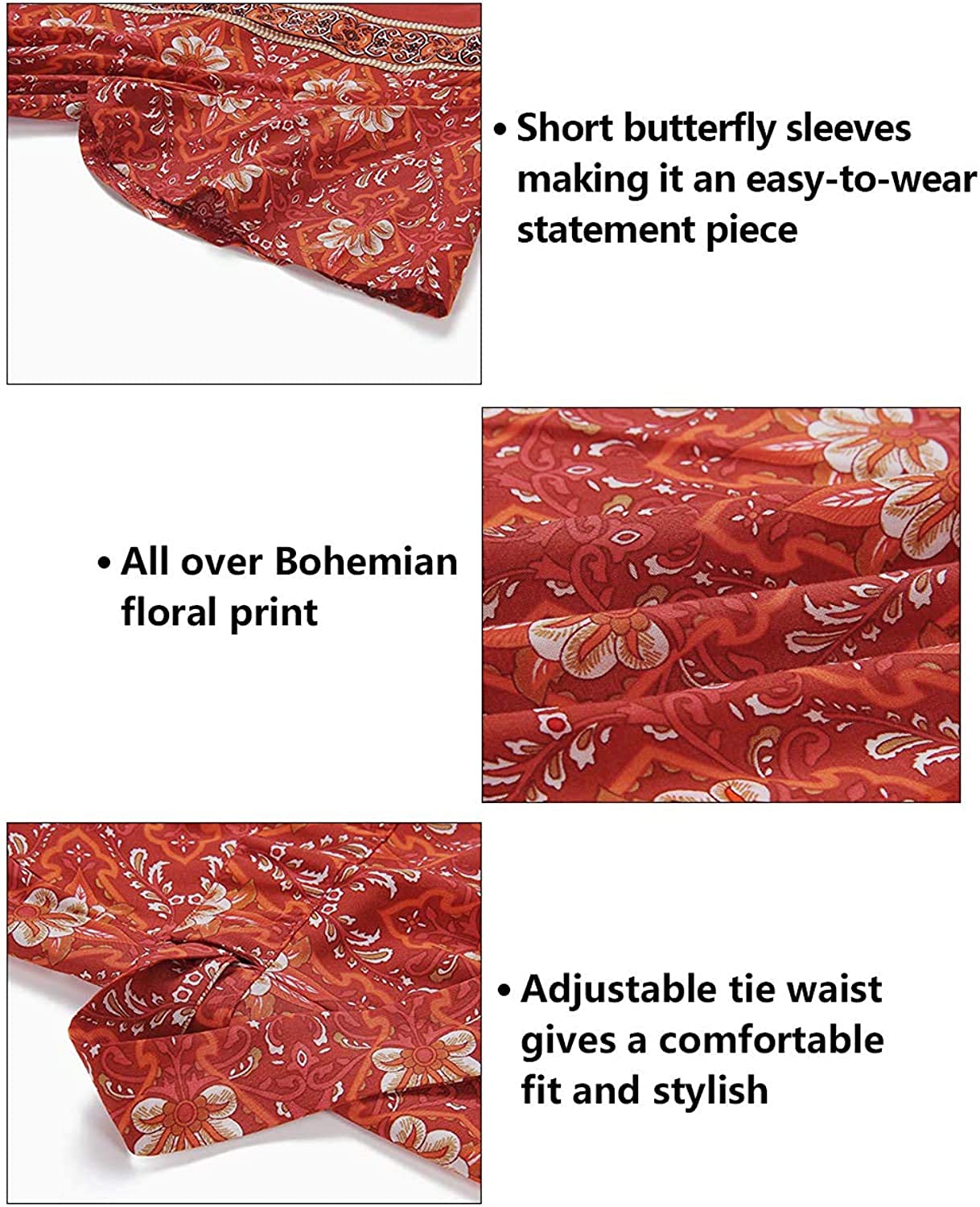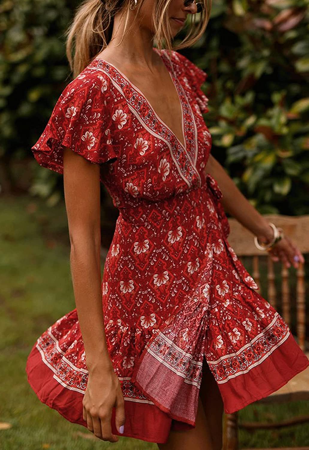 Women’s Summer Wrap V Neck Bohemian Floral Print Ruffle Swing A Line Beach Mini Dress